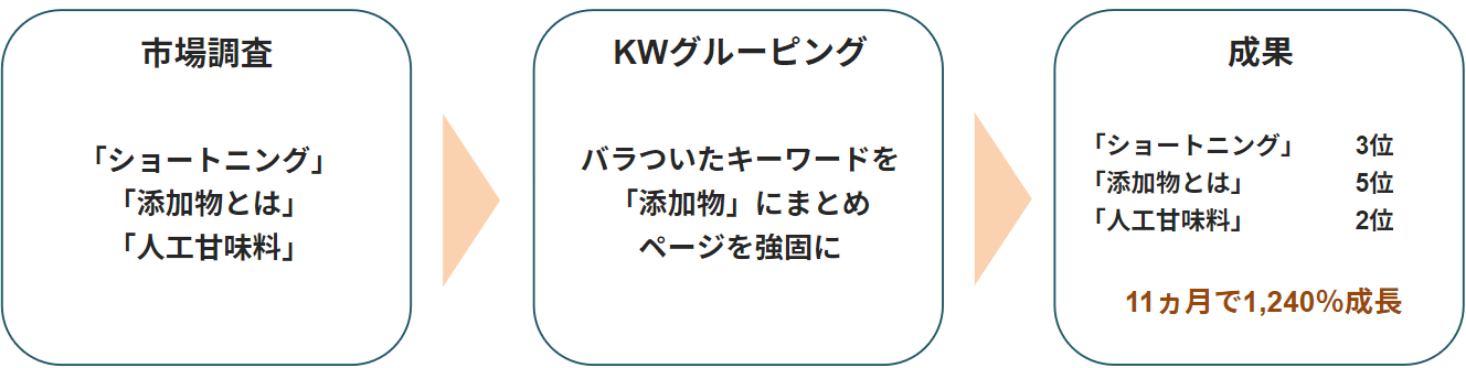 | ポイント | キーワードをグルーピング化し確実にとりたいキーワードで順位改善 |