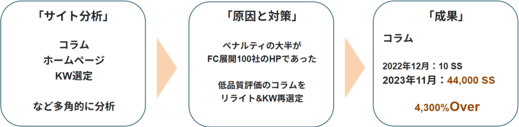 調査した結果ペナルティの原因がFC展開している100店舗のHPにあったため、全社のHPを分析。ネガティブ要素を特定し排除しきる。コラムに関してもほぼ低品質評価を受けていたため、フルリライトと他重要KWで新規記事作成。